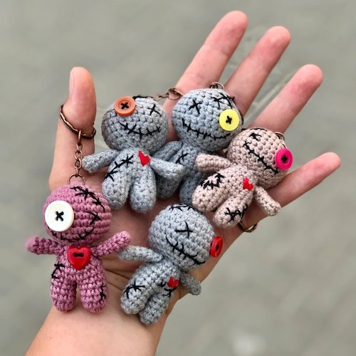 Creepy, cute, and totally irresistible! These mini voodoo doll keychains are the perfect mix of spooky and sweet—with button eyes, stitched smiles, and little hearts that practically scream “hug me… or else!” Make them for Halloween, gift one to your ride-or-die, or lean into that soft goth aesthetic—this pattern is wickedly fun and full of character. Stitch at your own risk—you might get attached.