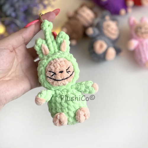 Ending on a high note—literally! This smiling bunny keychain is pure fuzzy joy in crochet form. With its oversized grin, plushy texture, and adorable onesie-style outfit, it’s the kind of project that makes you smile while you’re stitching. A perfect little gift for someone who could use a mood boost… or to keep as your own tiny ball of good vibes.